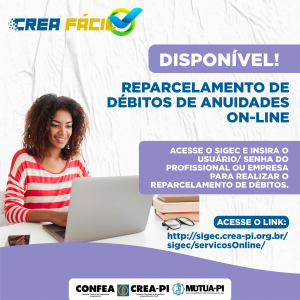 O Conselho Regional de Engenharia e Agronomia do Piauí (Crea-PI) lança, nesta quarta-feira (19/05), mais uma novidade do Crea Fácil: o Reparcelamento de Débitos de Anuidades