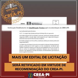 Mais um Edital de Licitação será retificado em virtude de recomendação do Crea-PI.