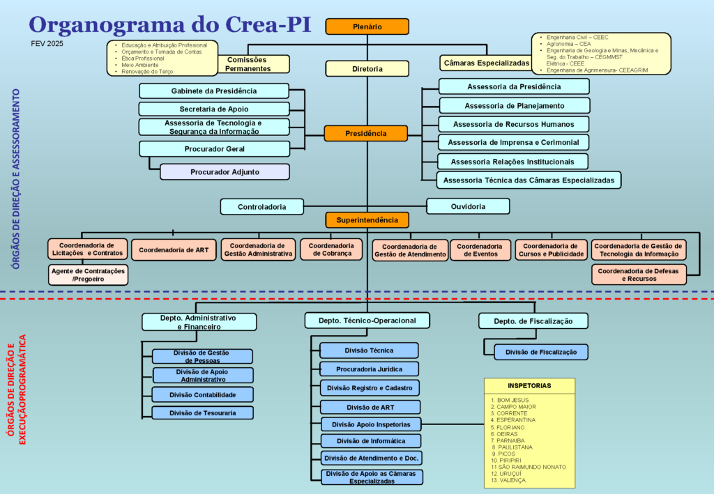 O Conselho Regional de Engenharia e Agronomia do Piauí – Crea-PI é entidade autárquica de fiscalização do exercício e das atividades profissionais dotada de personalidade jurídica de direito público, constituindo serviço público federal, vinculada ao Conselho Federal de Engenharia e Agronomia – Confea, com sede e foro na cidade de Teresina e jurisdição no Estado do Piauí, instituída pela Resolução nº 234, de 19 de setembro de 1975, na forma estabelecida pelo Decreto Federal nº 23.569, de 11 de dezembro de 1933, e mantida pela Lei n° 5.194, de 24 de dezembro de 1966, para exercer papel institucional de primeira e segunda instâncias no âmbito de sua jurisdição. O Crea-PI possui 13 Inspetorias atuando no estado: Esperantina, Bom Jesus, Campo Maior, Corrente, Floriano, Parnaíba, Paulistana, Picos, Piripiri, São Raimundo Nonato, Oeiras, Uruçuí e Valença.